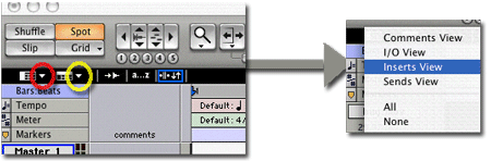 - Click the small arrow to access the track options pop up menu, and select "Inserts View."